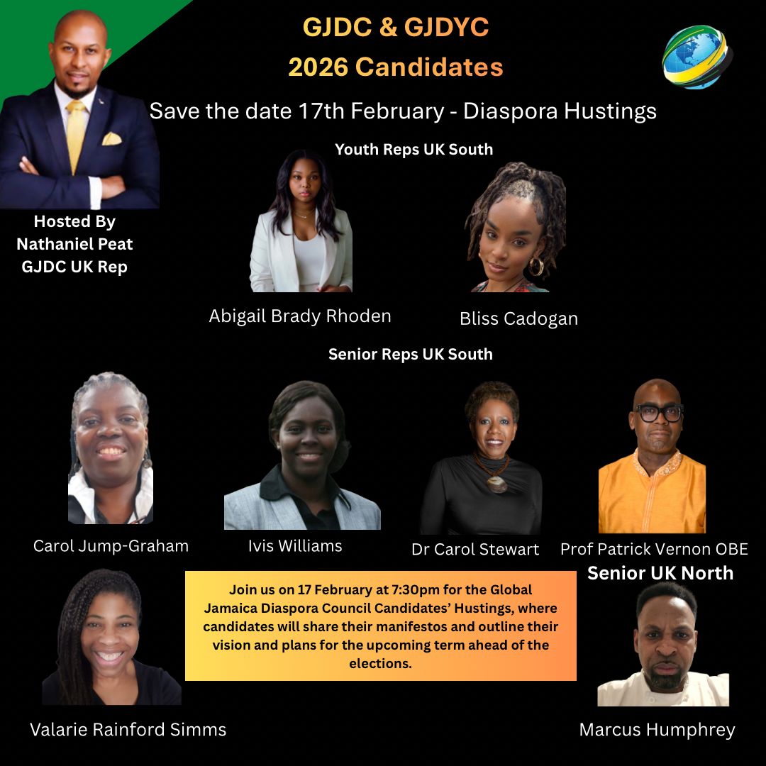 On 17 February 2026 at 7:30 PM (UK time), members of the Jamaican diaspora community across the UK and beyond are invited to come together for a vital conversation about the future of diaspora leadership and engagement. The Global Jamaica Diaspora Council (GJDC) and Global Jamaica Diaspora Youth Council (GJDYC) UK Manifesto Hustings, hosted by the current GJDC UK South Representative, Nathaniel Peat, will provide a platform for candidates to share their vision, priorities, and plans for strengthening Jamaica’s global diaspora.