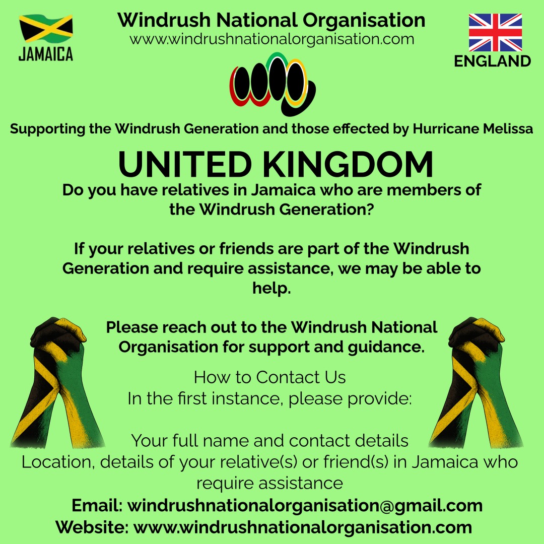 Do you have relatives or friends in Jamaica who are part of the Windrush Generation or their families? The Windrush National Organisation may be able to help. Their current appeal invites UK-based families to get in touch if loved ones in Jamaica require assistance, especially in the aftermath of Hurricane Melissa.