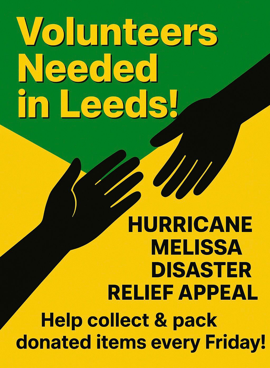 The Jamaica Society Leeds is calling for volunteers to help collect donations, pack relief boxes, and record items for those affected by Hurricane Melissa.